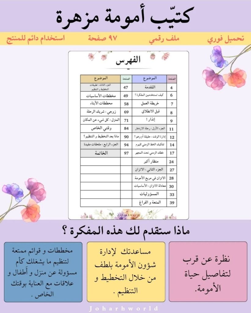 لذلك عمدت على مناقشة مواضيع جانبية تحول حول الأمومة لكن لا تدخل في صلبها. مثل : تخطيط الوجبات اليومية ، خطة العناية بالمنزل ، خطط تتعلق بالتنظيم العام لليوم و الأسبوع و الشهر و غيرها .
